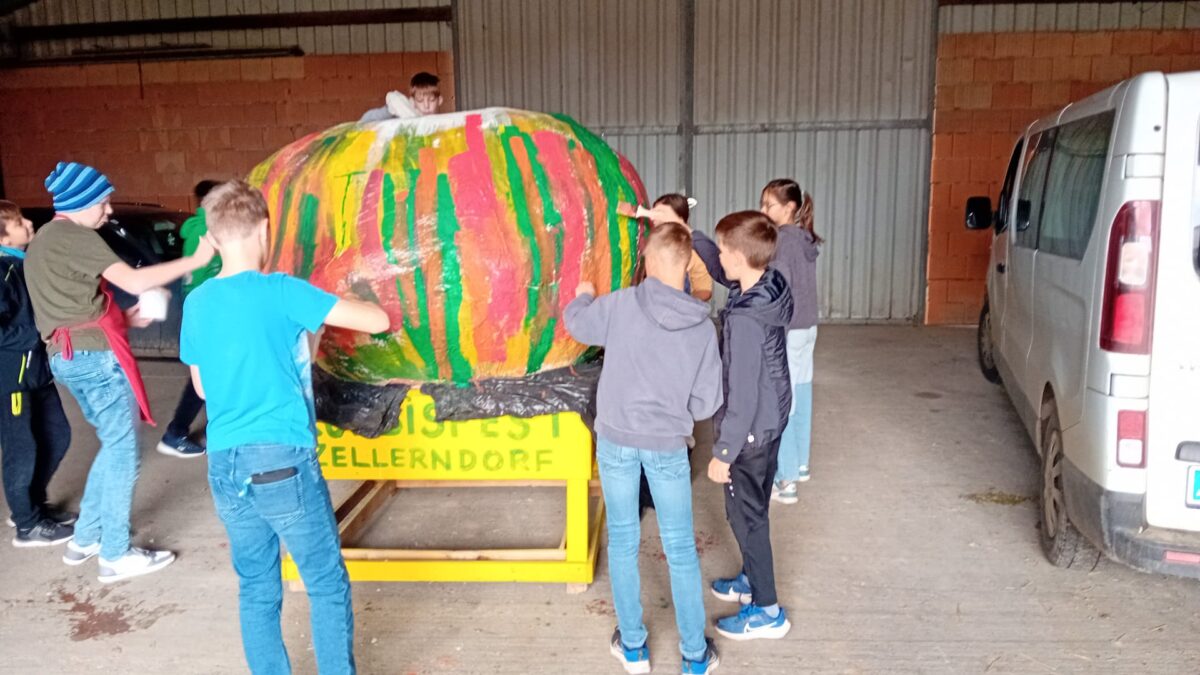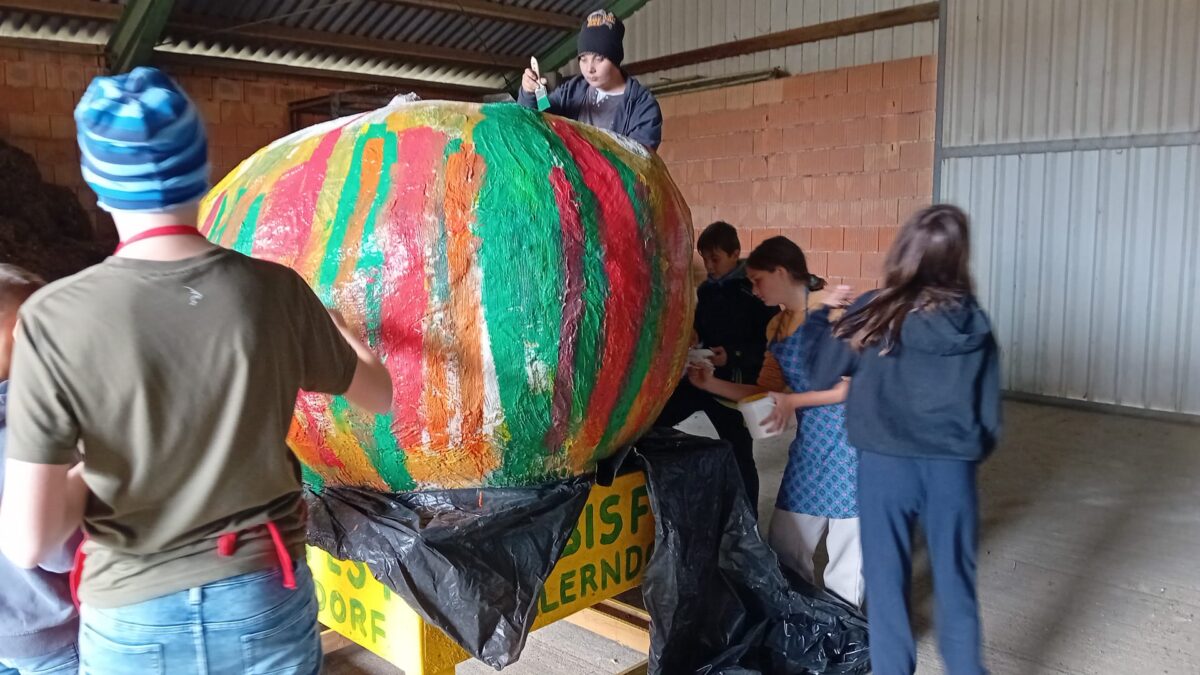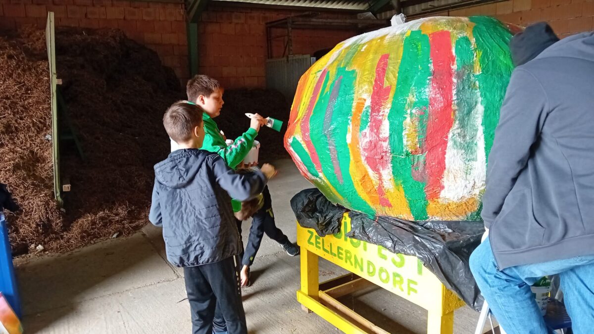 Die Vorbereitungen fürs Kürbisfest sind in vollem Gange. Herr Christian Schörg bemalt mit der dritten Klasse einen Riesenkürbis.